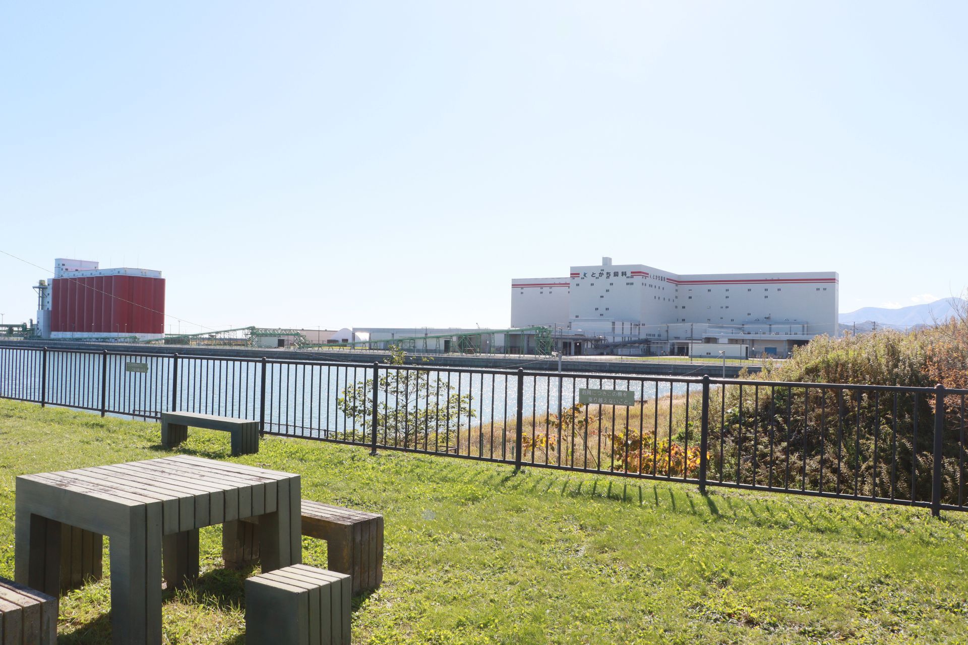 画像は十勝港親水緑地からの眺め。知る人ぞ知る、海を眺めながらのんびりできる穴場スポットです。とかち飼料を海側から見ることができますよ。
